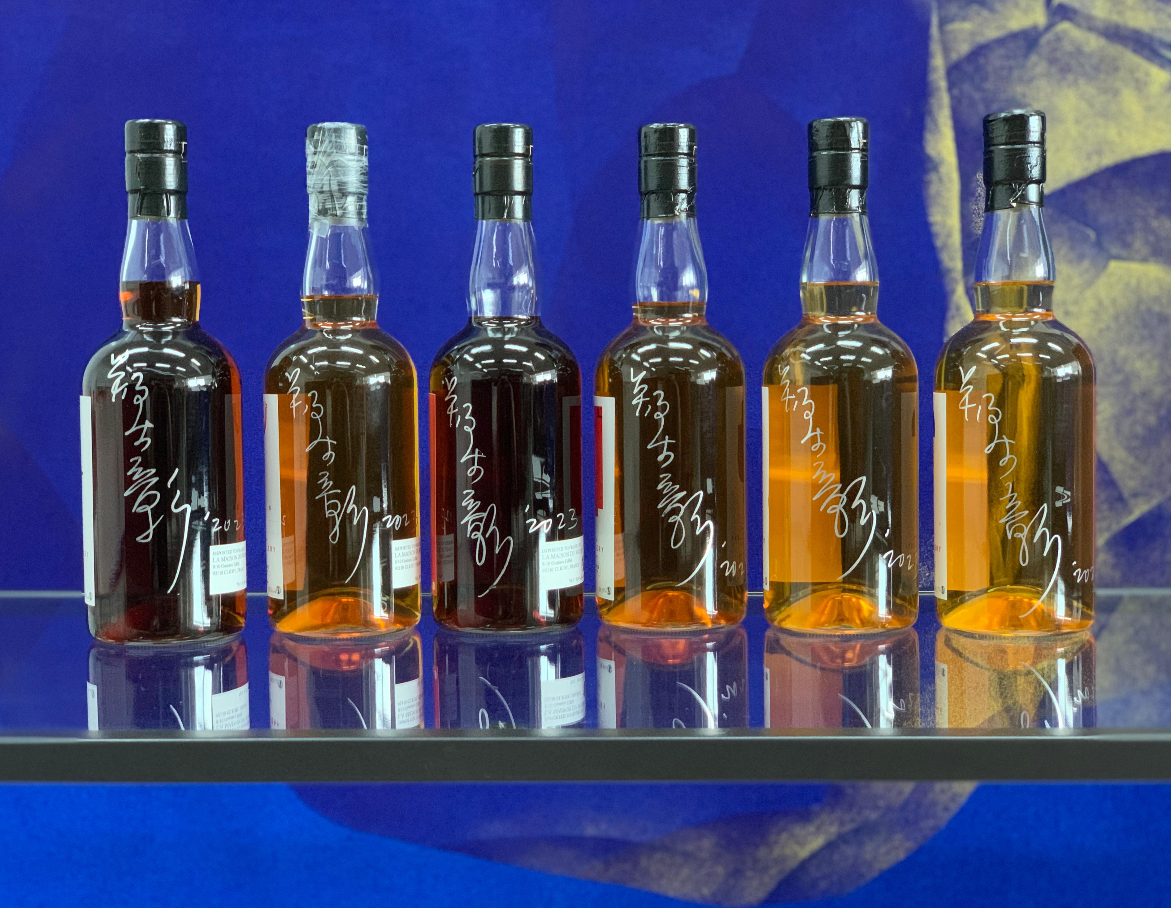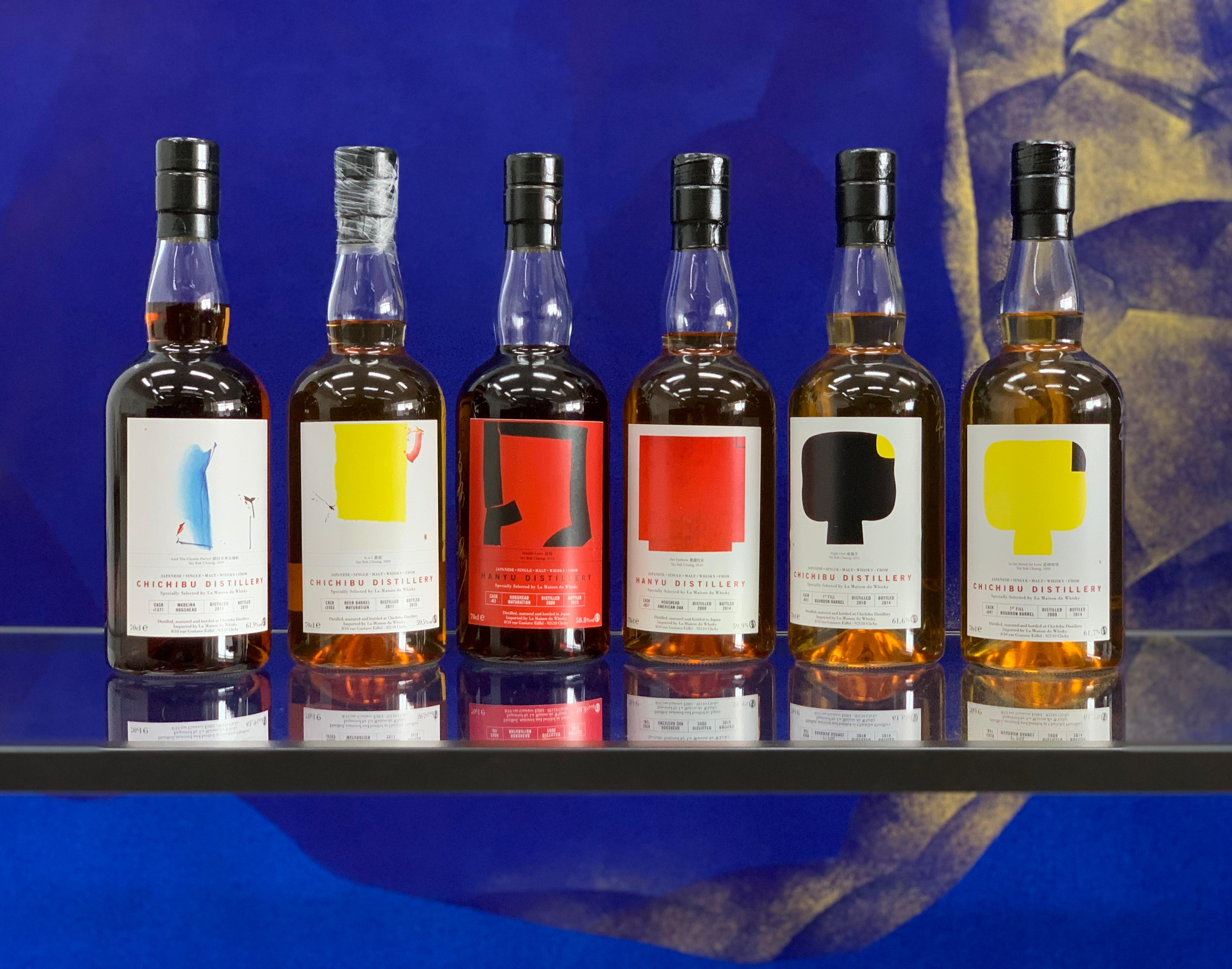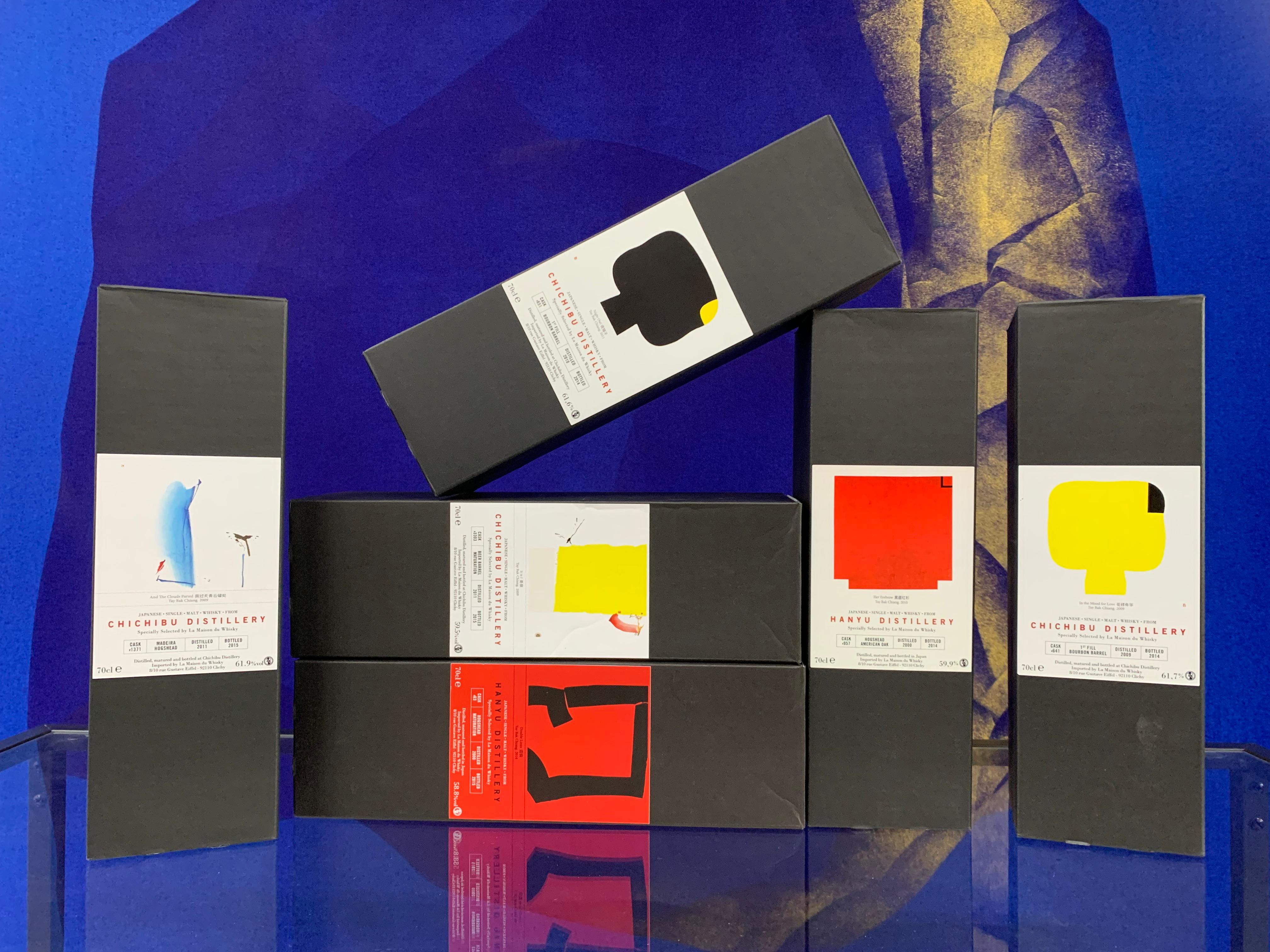 Japanese single malt whiskies from Chichibu Distillery and Hanyu Distillery, by La Maison du Whisky, with works from my Lotus Pond and Bird + Flower series, featured on their labels.